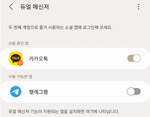 먼저 갤럭시 스마트폰 전체 설정에서 "유용한 기능"에서 맨 하단에 "듀얼 메신저"를 누르면 사용 중인 앱 카카오톡 버튼을 오른쪽으로 넘겨 카톡 듀얼 앱을 추가 설치하는 방법입니다.