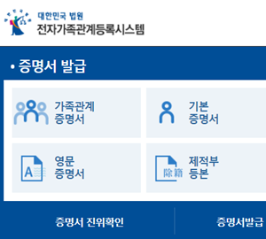 온라인 "대법원 전자가족관계등록시스템" 홈페이지에서는 별도의 회원가입 없이 개인 인증을 통해 가능합니다. 증명서 발급에서 가족관계 증명서 발급을 누릅니다.