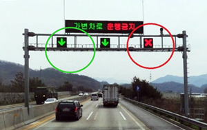 일반 도로가 꽉 막혀있는 상황에 갓길에 있는 표지판에 소형차 전용도로가 있다는것을 보게됩니다. 빨간색 엑스(X) 표시가 되어있을땐 이용하면 안됩니다.